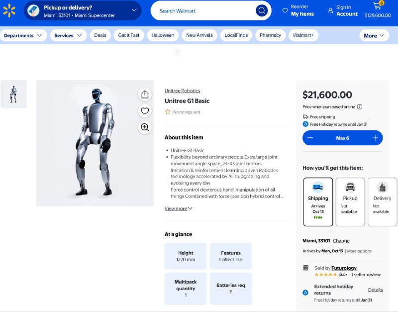 🖼 沃尔玛现在直接在美国境内销售宇树 G1人形机器人,只有基本款可供选择,价格为21600美元,免费送货,一次可以订购六台。