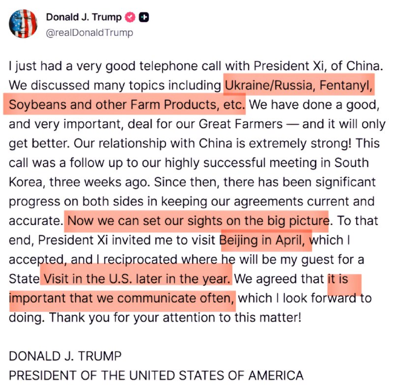 ↩️ 习近平特朗普11月24日通电话,邀请他明年4月访问北京。 双方讨论了俄乌、芬太尼、大豆等问题。特朗普说,已为美国农民达成了重大协议,成果会越来越好;釜…