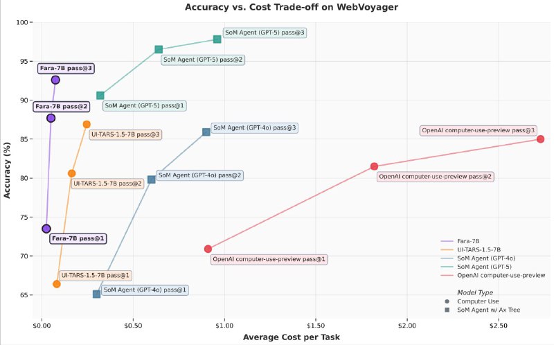 Fara-7B 依赖浏览器截图进行视觉感知,无需访问无障碍树等结构信息,即可预测点击、输入、滚动等操作步骤,支持表单填写、检索、比价、预订等多步网页任务。模型基于 Magentic-One 多智能体系统生成的合成数据训练,总计约 14.5 万条任务轨迹。