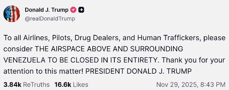 特朗普:“致所有航空公司、飞行员、毒贩和人口贩子,请务必将委内瑞拉上空及周边空域视为已被彻底关闭。”