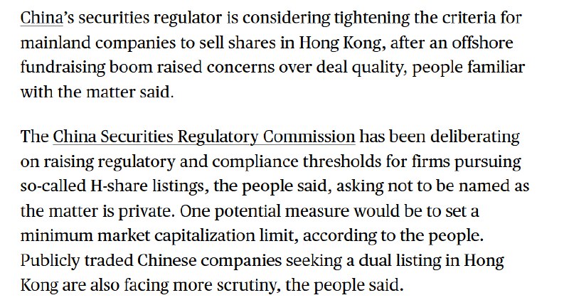 🖼 彭博:在境外融资热潮引发担忧后,中国证监会正考虑收紧内地企业在香港发售股票的相关标准,以遏制过度投机并确保境外发行人质量,其中可能包括设定最低市…