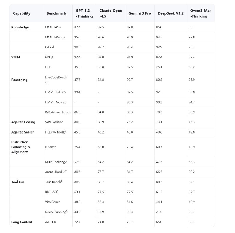 2026年1月26日,Qwen团队发布Qwen3-Max-Thinking,定位为旗舰推理模型。官方称通过扩大模型参数规模并投入更大规模强化学习训练算力,模型在事实知识、复杂推理、指令遵循、人类偏好对齐与智能体能力等维度提升,并在19项基准测试上与GPT-5.2-Thinking、Claude-Opus-4.5、Gemini 3 Pro等顶尖模型表现接近甚至超越。