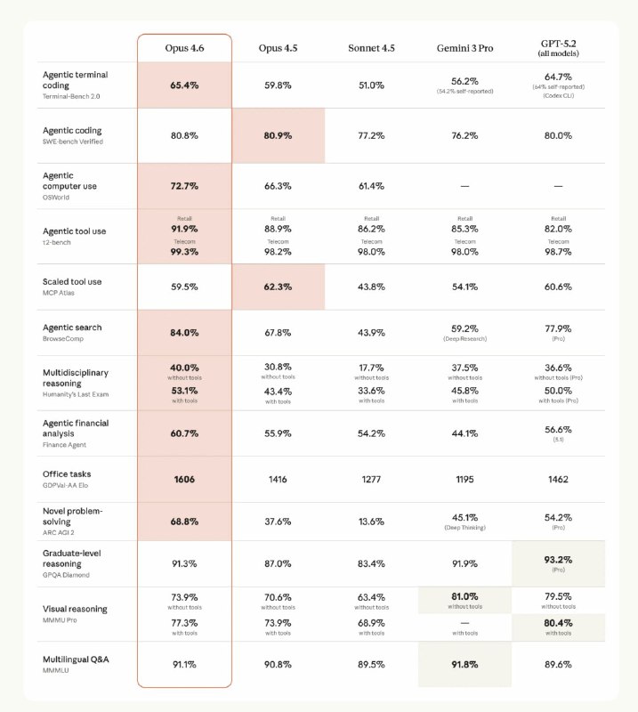 Anthropic 表示,Opus 4.6 也面向知识工作场景,可用于金融分析、研究,以及创建与处理文档、表格和演示文稿;并可在 Cowork 中进行多任务自主执行。在评测披露中,Anthropic 称 Opus 4.6 在 Terminal-Bench 2.0(智能体式编码评测)取得最高分、在 Humanity’s Last Exam 领先;在 Artificial Analysis 运营的 GDPval-AA 上,较 OpenAI GPT-5.2 约高 144 Elo、较 Opus 4.5 高 190 Elo,同时在 BrowseComp(在线难检索信息定位)上也优于其他模型。
