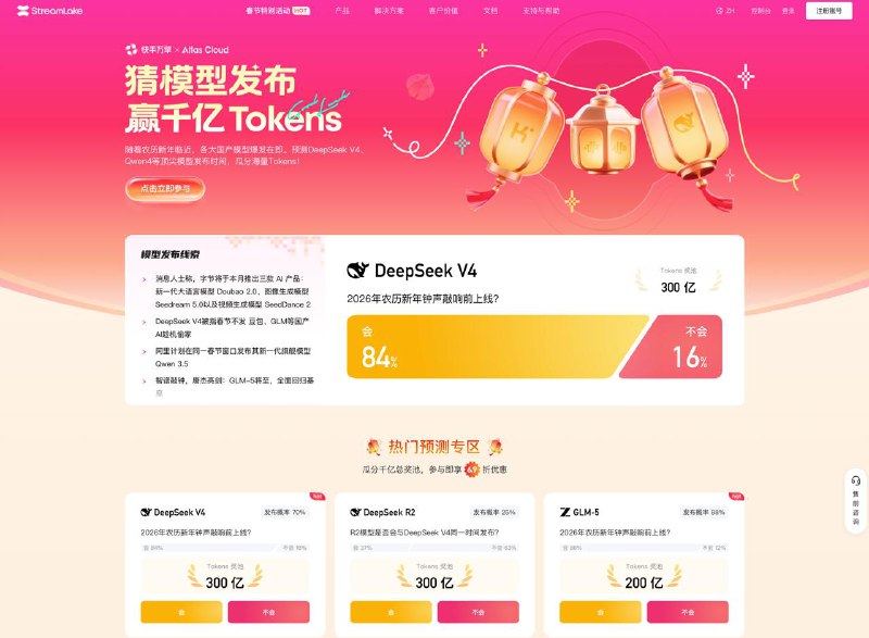 🖼 猜模型发布,赢千亿 Tokens StreamLake(快手旗下的云服务品牌)发起的春节特别营销活动 以“预测国产大模型发布时间”为互动玩法,参与者可按规则获得 Tok…
