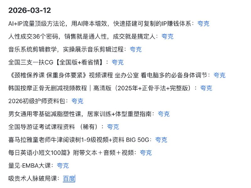 🖼 🤩2026-03-12 实用教程 1️⃣ 搞钱破局: AI+IP流量变现、人性成交、人脉吸贵术 2️⃣ 回血养生: 颈椎急救保养、正骨手法、减脂塑形 3️⃣ 硬核考证: …