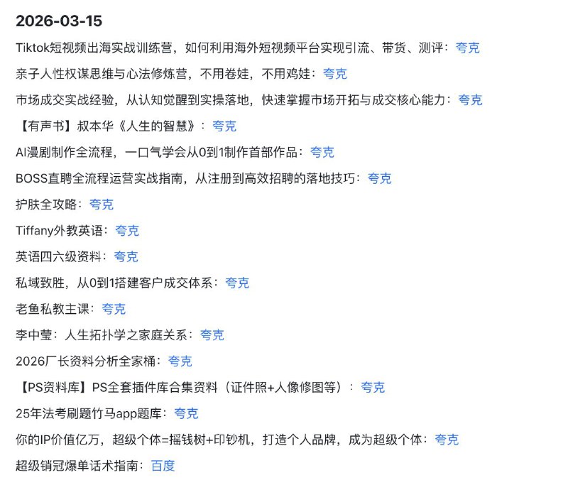 🖼 🌔2026-03-15 实用教程 1️⃣ 自媒体与IP: TikTok出海、AI漫剧制作、个人品牌打造 2️⃣ 商业成交: 私域致胜、市场实战、销冠爆单话术 3️⃣ 硬核考证…