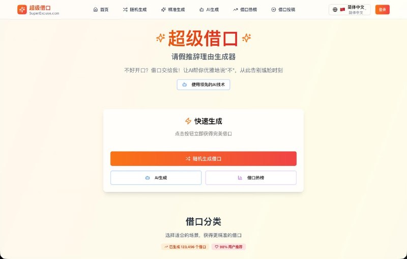 🖼 超级借口:请假推辞理由生成器 让AI帮你优雅地说不,从此告别尴尬时刻 👉https://superexcuse.com/