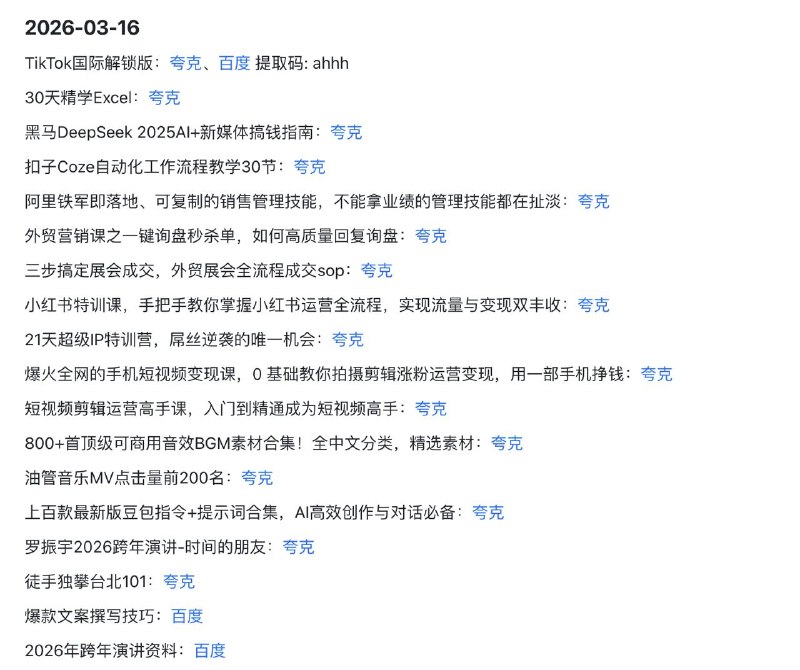 🖼 🗣2026-03-16 实用教程 1️⃣ AI前沿: DeepSeek指南、Coze工作流、豆包提示词 2️⃣ 流量变现: TikTok解锁、小红书IP、爆款短视频运营 3️⃣ 高阶销售…