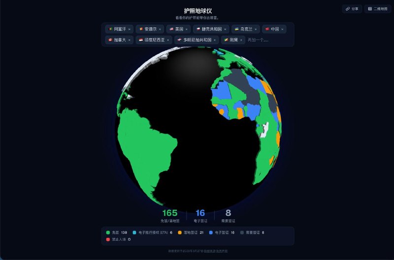 🖼 🗣️Passport Globe :一个交互式3D 护照出行可视化工具 专门帮你可视化护照免签/落地签/电子签的旅行目的地 选中任意国家/地区护照后,地图上会直接标出…