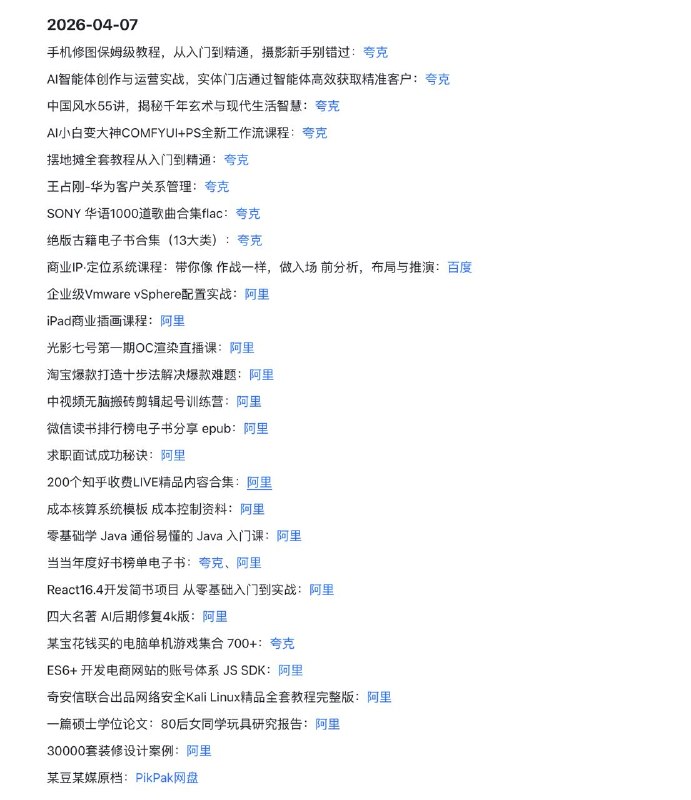 🖼 🗣️2026-04-07 实用教程 1️⃣ 硬核IT与AI: Kali网络安全、VMware架构、React/Java开发、ComfyUI工作流、AI门店实战 2️⃣ 搞钱与商业: 商业IP定位、…