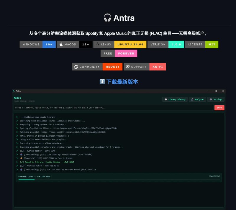 🖼 Antra一个桌面端音乐下载工具 可以把 Spotify / Apple Music 的歌单直接下载为无损 FLAC,无需任何付费账号 自动打 tag、整理文件夹,还集成了 Soulseek P2…