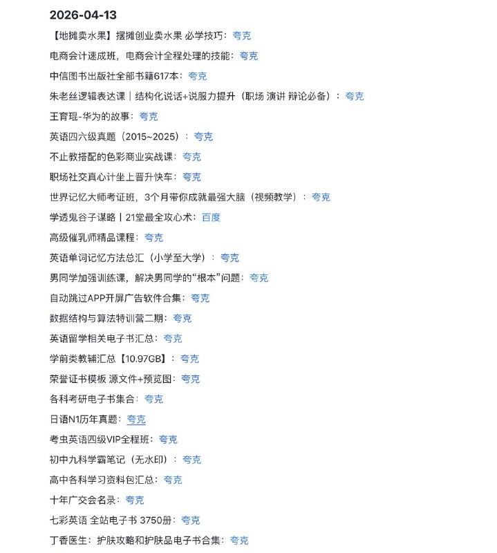 🖼 🗣️2026-04-13 实用教程 1️⃣ 商业与职场: 摆摊创业、电商会计、广交会名录、逻辑表达、华为故事 2️⃣ 考学与教辅: 四六级/考研/N1真题、初高中笔记…