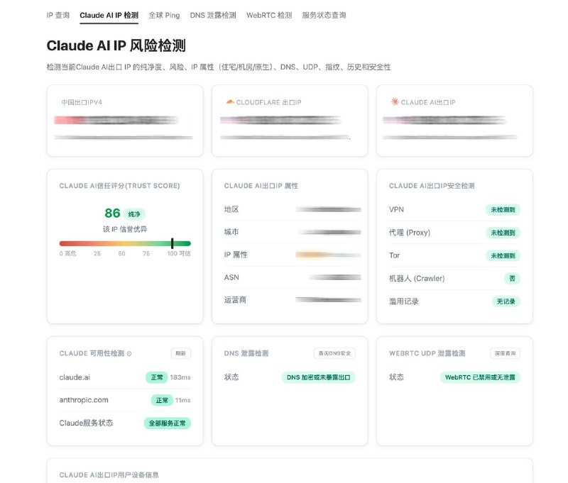 检测当前Claude AI出口 IP 的纯净度、风险、IP 属性(住宅/机房/原生)、DNS、UDP、指纹、历史和安全性