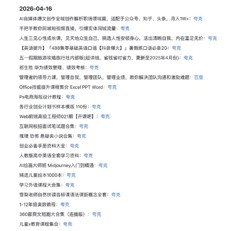 🖼 🗣️2026-04-17 实用教程 1️⃣ 商业与搞钱: 小红书/亚马逊电商实操、外贸副业课、营销战术、华为基本法 2️⃣ 技能与考学: PR/AE全能剪辑课、短视频拍…