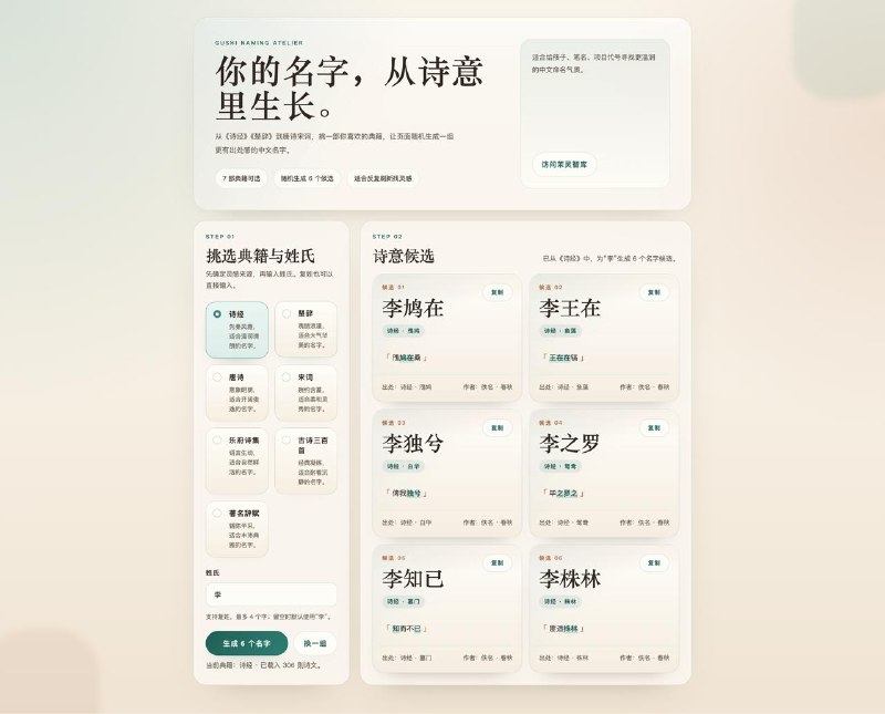 🖼 GUSHI Naming Atelier:一个古诗文起名小工具 从《诗经》《楚辞》唐诗宋词等7部典籍里随机抽取字词,帮用户生成有出处的中文名字 #网站 👉https://go.88l…
