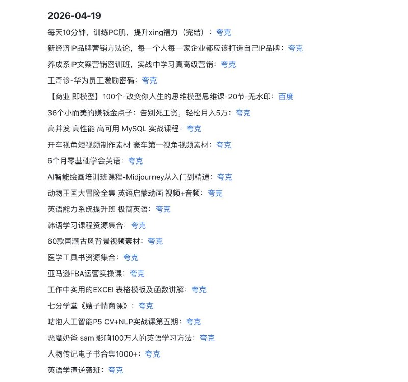 🖼 🗣️2026-04-19 实用教程 1️⃣ 硬核IT与AI: MySQL高并发实战、咕泡人工智能CV+NLP、Midjourney绘画精通 2️⃣ 商业与搞钱: 亚马逊FBA实操、36个赚钱金…