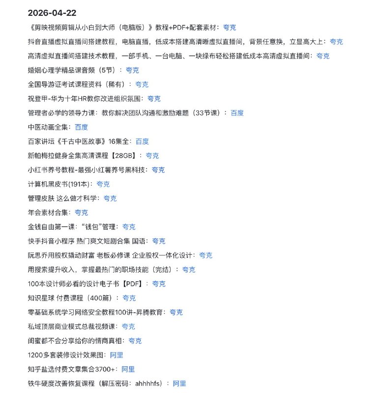 🖼 🗣️2026-04-22 实用教程 1️⃣ IT与技能: 网络安全实战、191本计算机黑皮书、剪映精通、搜索变现实操、百本设计神书 2️⃣ 商业与职场: 虚拟直播间搭…