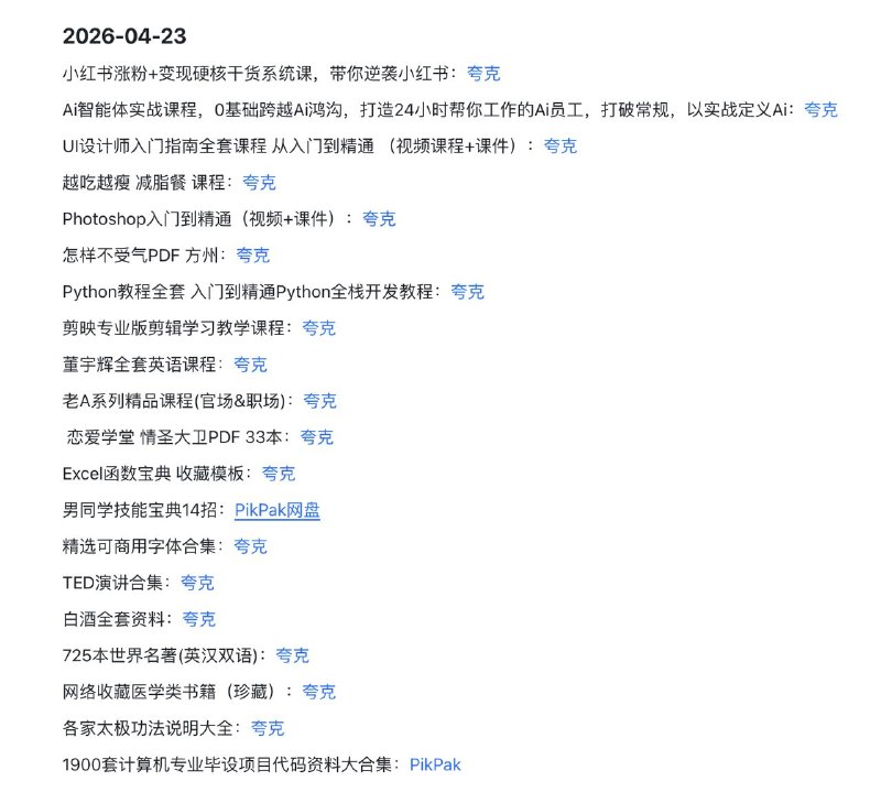 🖼 🗣️2026-04-23 实用教程 1️⃣ IT硬核与AI设计: Python全栈/1900套计算机毕设源码、AI智能体实战、UI设计与PS精通 2️⃣ 商业变现与职场: 小红书涨粉…